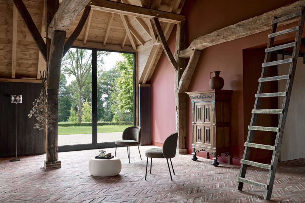 Voor de restauratie van de dwarsritschuur is het gelukt om een volledig traditioneel gebintwerk aan te schaffen. Dit prachtige houtwerk is afkomstig van een gesloopte schuur in het Gelderse Vragender. Het gerenoveerde gebouw combineert authentieke elementen, met moderne details om een betere lichtinval te creëren.
