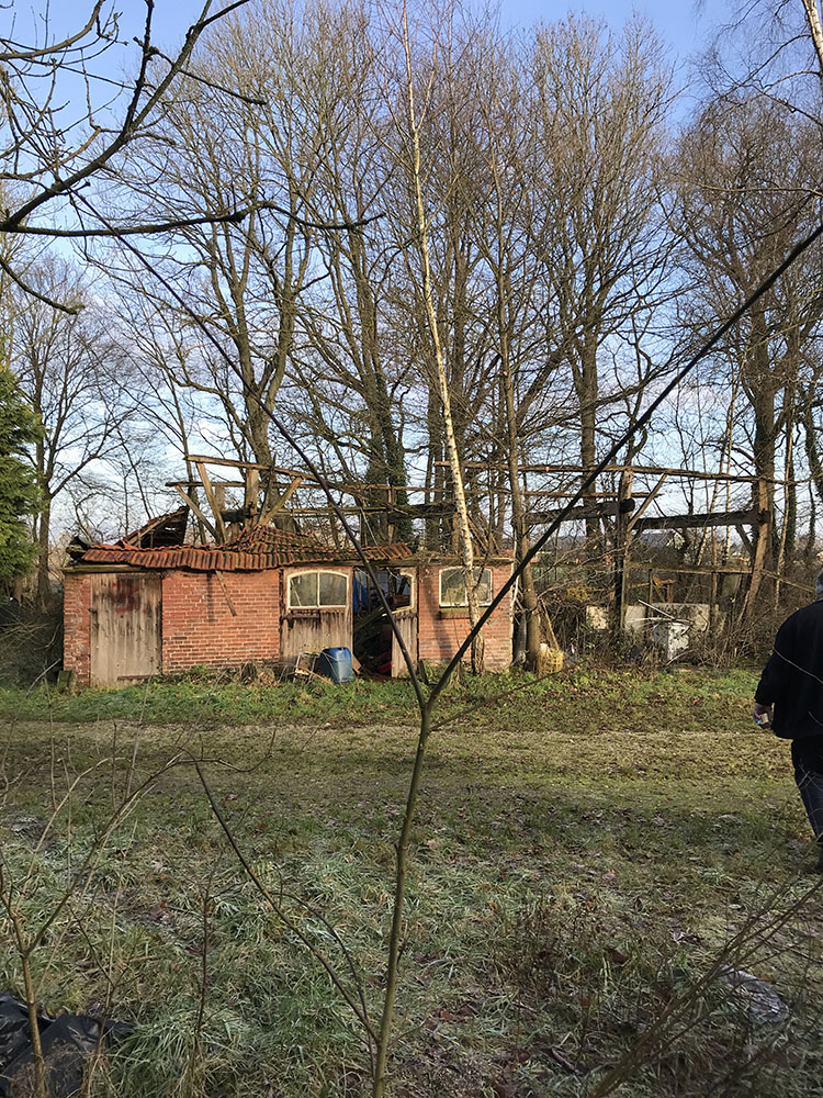 Hiernaast is te zien hoe de dwarsritschuur in de loop der jaren in verval is geraakt. Een treurig beeld, met een ingestort dak en bomen die dwars door het pand heen groeiden.